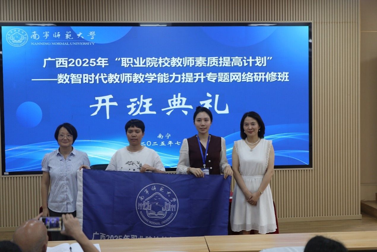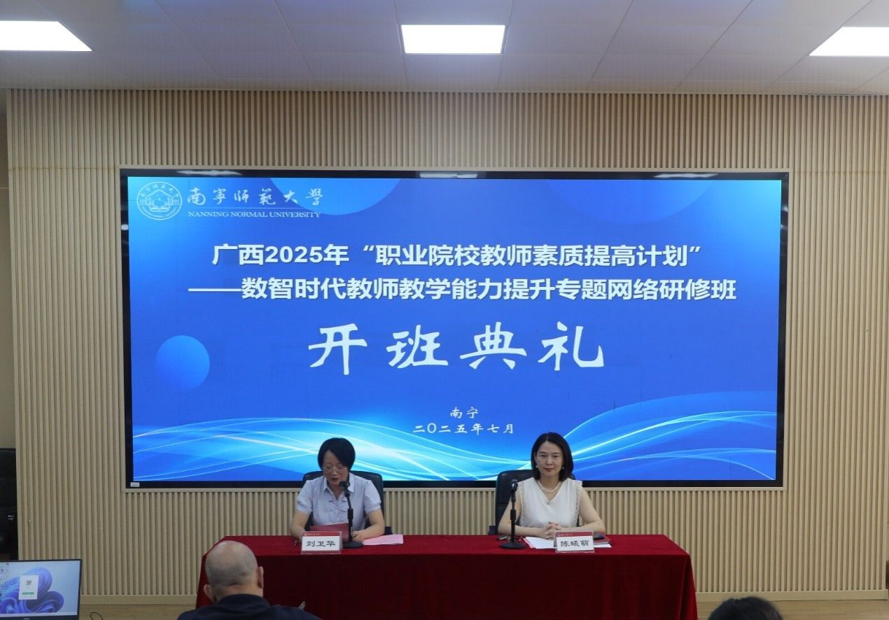 为加快推进职业教育数字化转型,提升教师数字素养与教学创新能力,由广西壮族自治区教育厅主办、南宁师范大学职业技术师范学院承办的“2025年职业院校数字时代教师教学能力提升网络研修项目坊主集中培训”于7月3日正式开班。来自全区地市教育局、区直中职、高职院校约100多名坊主参加本次开班。